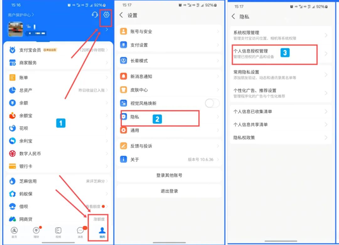 打开支付宝App → 点击“我的”→“设置”(右上角齿轮图标)→ “用户保护中心”→“个人信息授权管理”,选中对应的应用或小程序→ 解除授权。
