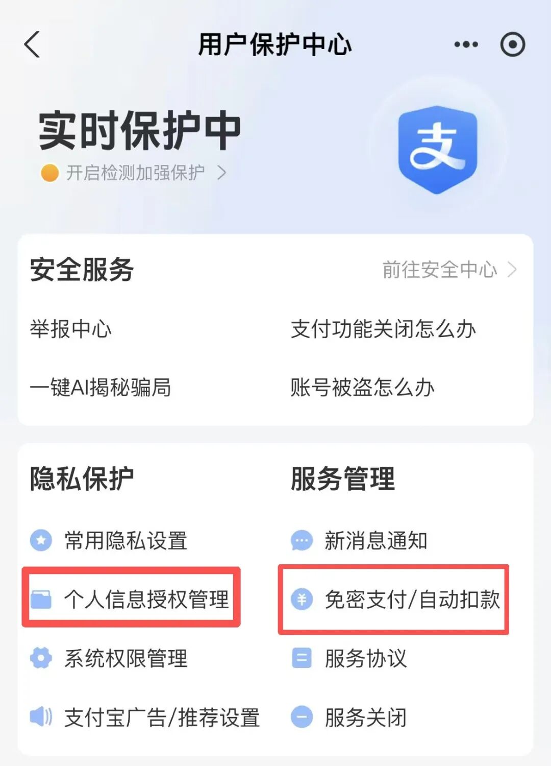 同样在“用户保护中心”页面,可以找到“免密支付/自动扣款”入口。由于自动续费服务易被遗忘,而且即便已经卸载了应用仍可能扣费,因此有必要关闭。