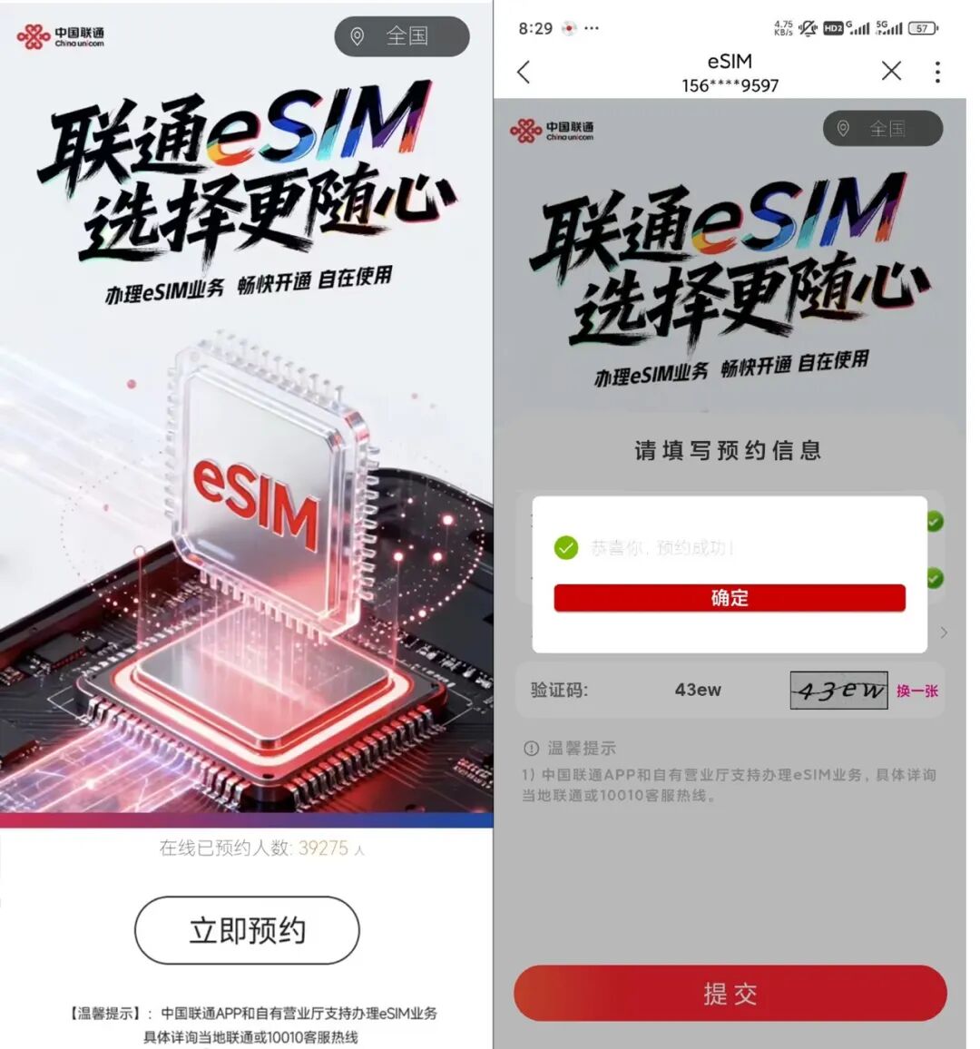 用户可登录中国联通 App,在首页顶部入口进入“eSIM 预约专区”,填写姓名、手机号、地址等相关信息后,即可完成预约登记。