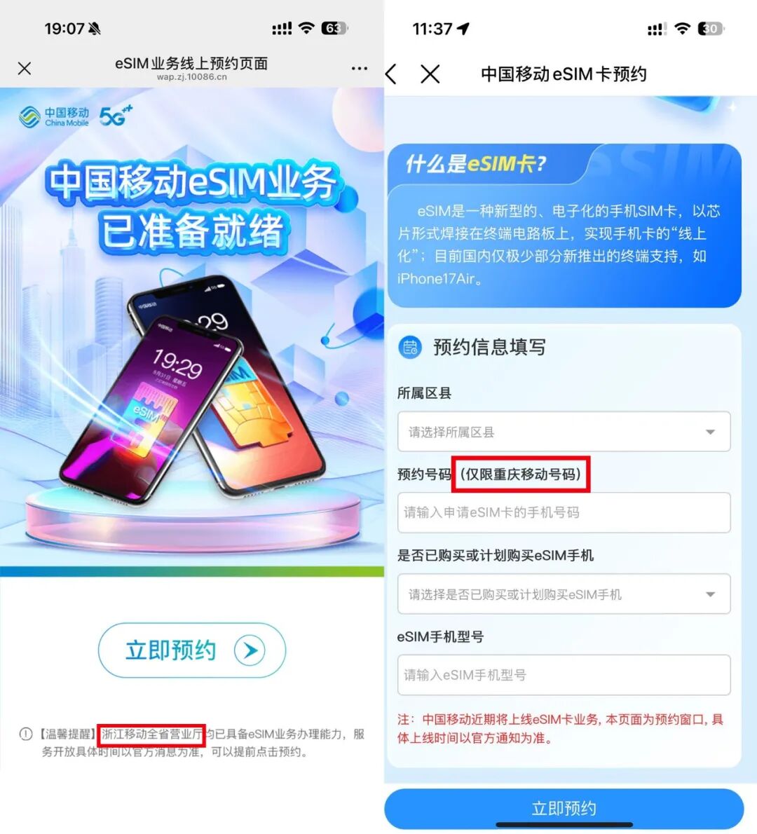 此前,中国移动已于 9 月 21 日正式上线 eSIM 预约界面,但仅限重庆、浙江移动号码可预约,且具体开放时间未定。