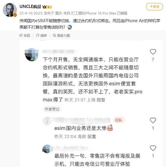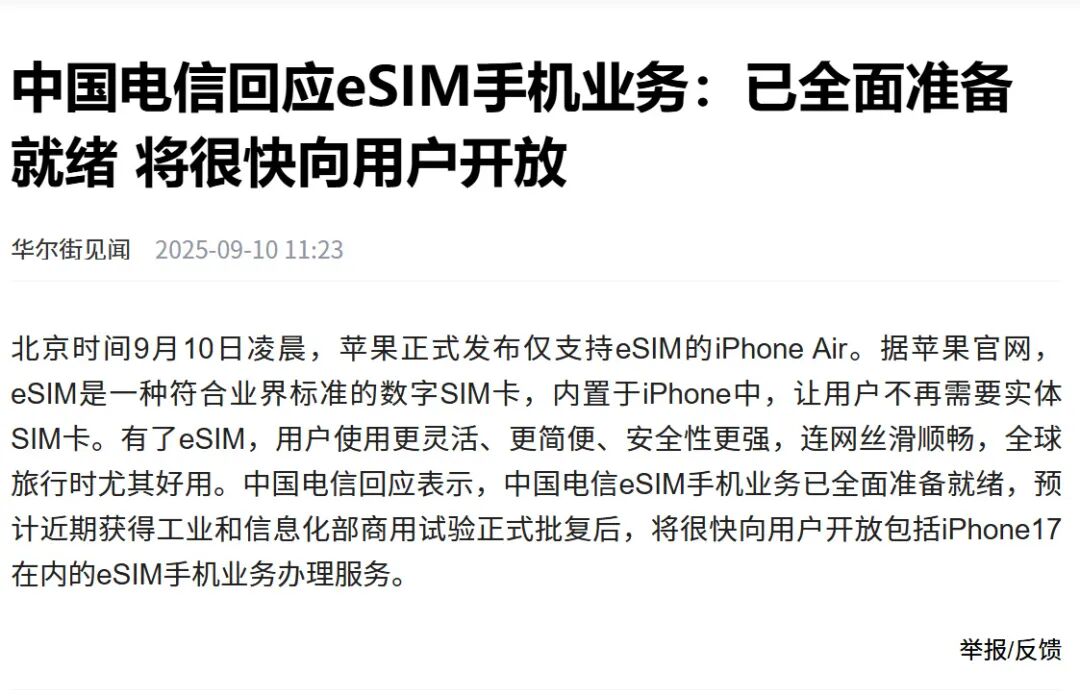 目前,业内预测 eSIM 业务将在 10 月随 iPhone Air 上市同步开通,但具体时间取决于工信部最终审批进度。