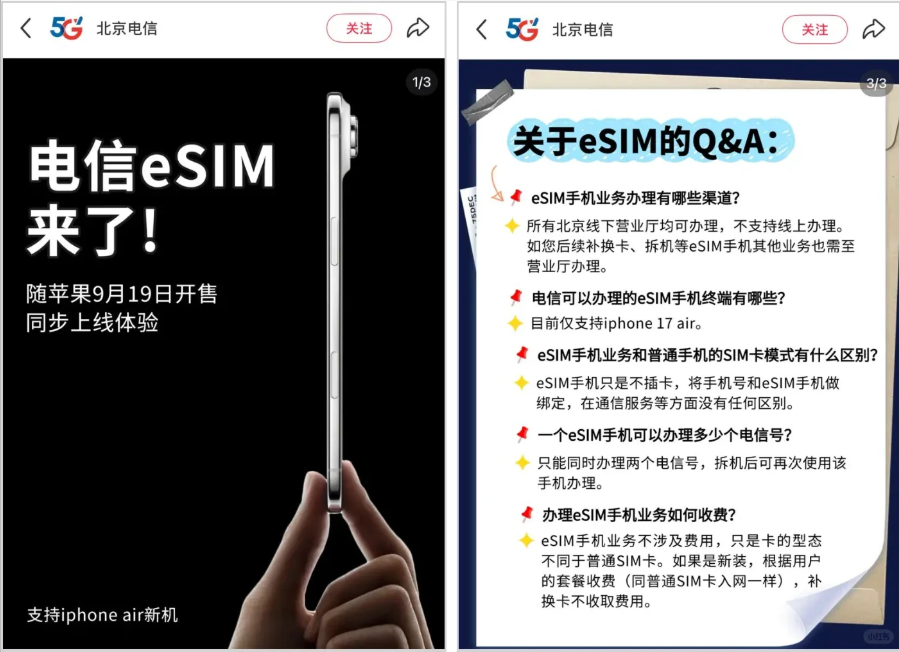 苹果公司推出的 iPhone Air 因仅支持 eSIM 技术,目前在国内的发售时间待定。这款手机设计极致轻薄,不支持实体SIM卡,需通过eSIM激活运营商网络,堪称全球首款“无卡槽手机”。而中国移动、中国电信和中国联通将为该手机提供 eSIM 支持。