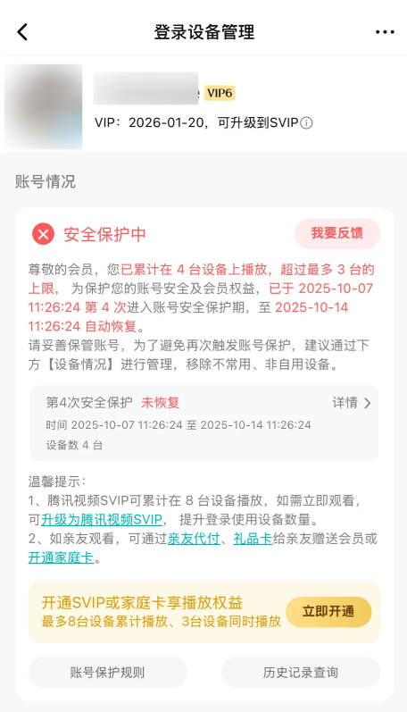 据截图,该网友腾讯视频 VIP 账号累计在 4 台设备上播放,超过最多 3 台的上限,已于 10 月 7 日第 4 次进入账号安全保护期,至 10 月 14 日自动恢复。
