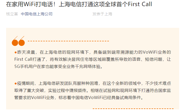 早在2022年5月20日,上海电信就成功打通了全球第一个具备端到端带溯源能力的 VoWiFi 电话。