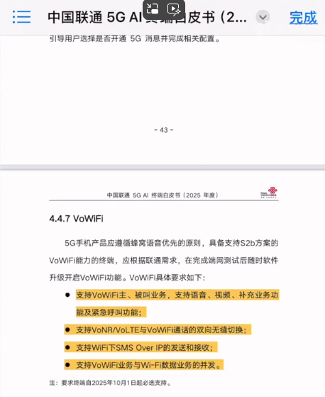 而中国联通和中国移动方面,也在试点和推广 VoWiFi 业务。比如中国联通 5G AI 终端白皮书(2025 年版)明确写了将支持 WiFi 通话服务。
