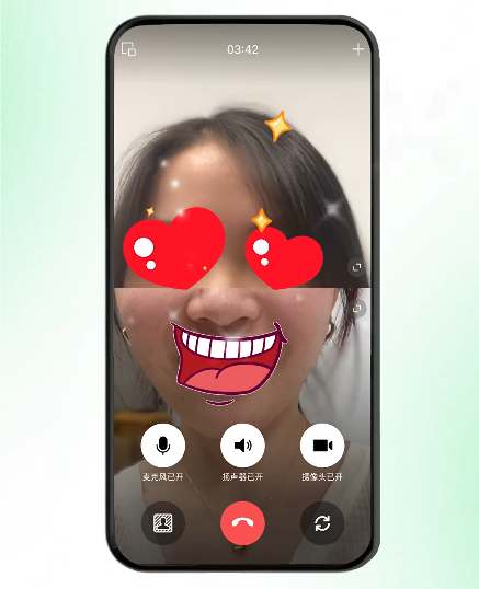 视频通话时,长按自己的小窗口拖至屏幕上方,可实现等分屏模式,双方画面将以同样大小并列显示,而不再是大小屏组合界面,便于拍摄“合照”,为远程互动增添趣味,比如可以通过这个方式实现“你的眼搭我的嘴”的趣味合照。